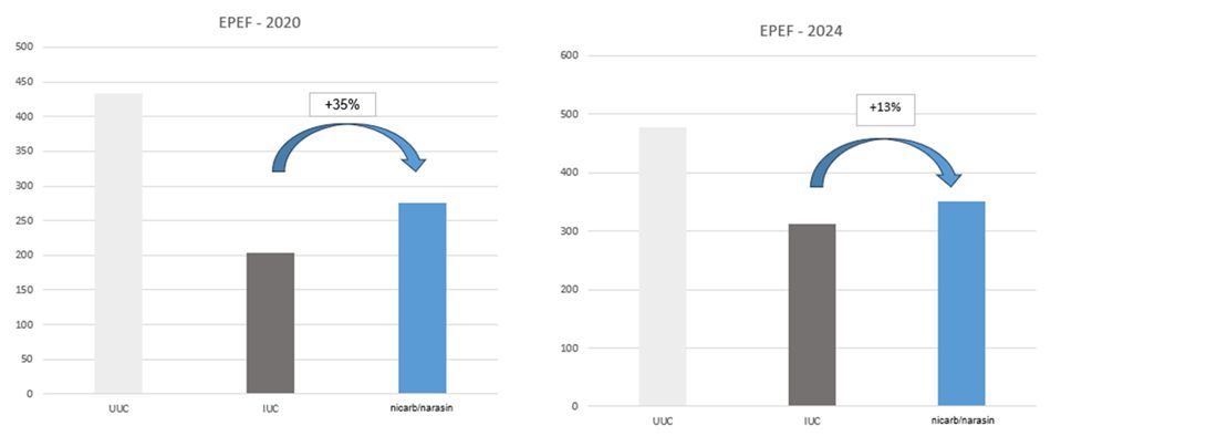 To demonstrate the possible danger of such practice, Huvepharma took field samples in 2020 and again in 2024. Both samples were used in an AST (anticoccidial sensitivity trial) and the combination product was tested on both occasions. Compared to the infected, untreated control (IUC) group, the performance improvement in 2020 was 35% which is considered as effective (Figure 1). The improvement in 2024 on the other hand was only 13% which is considered as bringing little benefit.